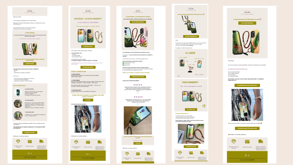 Conception et rédaction d’une séquence de vente en 5 emails dédiée au Pack Serenity, une offre packagée auprès d’un segment d’acheteurs dormants.
